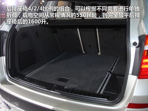 行李廂空間也是新X3的賣點之一,后排座椅4/2/4比例的組合,可以根據不同需要進行單獨折疊,載物空間從常規情況的550升起,到完全放平后排座椅后的1600升,充分滿足寶馬X3車主的需要。