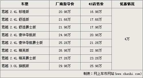 今年的7月8日,別克終于推出了帶著家族新元素特征的中級車市場的又一力作-新君越。新君越的加入無疑給別克軍團再次打了一針“興奮劑”,其與新君威形成了很好的市場互補。別克經銷店已經可以接受新君越的預訂工作,訂金為10萬元,并且為了清理老款君越的庫存車,老君越出現了全系降4萬元的優惠,具體價格請看下表: