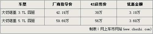 據(jù)經(jīng)銷商銷售人員介紹,大切諾基3.7L車型的優(yōu)惠金額為3.19萬元,而高排量的5.7L車型優(yōu)惠金額為3.69萬元,達(dá)到了全系的最高。在售的Jeep-大切諾基共分為3.7L四驅(qū)和5.7L四驅(qū)兩個(gè)車型。3.7L四驅(qū)型的優(yōu)惠金額經(jīng)3.19萬元的優(yōu)惠后,售價(jià)降為了39萬元。而排量稍大的5.7L四驅(qū)型的優(yōu)惠金額為3.69萬元,降價(jià)后的售價(jià)為56萬元。