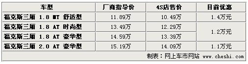 據4S店銷售人員介紹:目前福克斯三廂1.8升三款車型現車充足,尤其銀色、灰色、藍色、黑色車型現車較多,手動擋車型目前優惠1.4萬元,優惠后僅售10.49萬元,1.8升自動版車型優惠1.2萬元。2.0升車型目前現車較少,顏色也不齊全,訂車需等待3周左右,目前優惠1.1萬元。