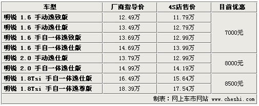 據(jù)4S店銷售人員介紹:目前明銳全系最高優(yōu)惠8500元,部分車型無(wú)現(xiàn)車,預(yù)定需等待1個(gè)半月至3個(gè)月時(shí)間。1.6升車型優(yōu)惠已達(dá)7000元,較之前優(yōu)惠幅度增加了1000元。2.0升車型優(yōu)惠仍為8000元,但個(gè)別經(jīng)銷商處有銀色、灰色現(xiàn)車,不過(guò)優(yōu)惠幅度最高僅6000元。1.8TSI的兩款車型優(yōu)惠8500元,較之前有所縮水,但目前經(jīng)銷商處有現(xiàn)車,顏色也較齊全。雖然1.6升車型優(yōu)惠幅度較之前有所增加,但目前依然沒(méi)有現(xiàn)車,需要預(yù)訂。如在店內(nèi)做裝飾還可打8折,雖然折后裝飾價(jià)格仍有些偏高,但產(chǎn)品質(zhì)量可以保證。