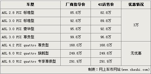 據北京奧迪經銷店銷售人員介紹,2.8L和近期剛上市的3.0L店內有現車,并且購買的消費者可以得到3萬元的優惠。經優惠后,全系最低配的2.8 FSI標準版售價從85.8萬元下降到了82.8萬元。銷售人員還介紹,4.2L以及6.0L Quattro版車型均無現車,欲購買著需交10萬訂金,等半年左右才可提車。