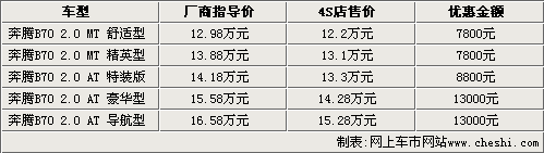 據(jù)一汽奔騰汽車4S店銷售人員介紹,目前09款奔騰B70現(xiàn)車顏色不全,主要以銀色車型為主,目前手動(dòng)擋車型只能優(yōu)惠7800元;上市不久的自動(dòng)特裝版能夠優(yōu)惠8800元;而另外兩款自動(dòng)擋車型現(xiàn)在能夠優(yōu)惠到13000元,如果到店詳談還能有更多的優(yōu)惠政策。2010款奔騰于九月十六日正式推出,售價(jià)在12.98萬至18.88萬元之間。