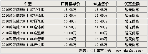 2010款榮威550上市后,隨著廠家產(chǎn)能的逐步提升,各家4S店的貨源問(wèn)題早已得到解決。據(jù)網(wǎng)上車市網(wǎng)站了解,目前北京地區(qū)的榮威4S店里的550全系現(xiàn)車比較充裕,暫時(shí)沒(méi)有現(xiàn)金優(yōu)惠,而老款車型各店已經(jīng)基本售空。具體詳情如下: