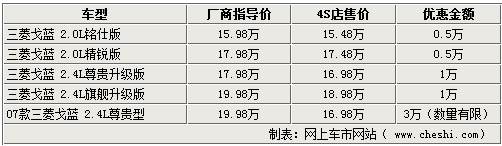 三菱戈藍2.0L新車已經上市了,而銷售境況卻與之前的09款2.4L車型一樣沒有完全鋪開。近日網上車市網站了解到,北京銷售的09款戈藍售價已經由前段時間的優惠8000元提升至現在1萬元;而剛剛上市的2.0L戈藍全系可給出5000元的優惠,另外部分商家還有07款的車型,直降3萬元銷售。具體詳情如下: