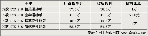 據4S店銷售人員介紹:目前在售的凱迪拉克09款CTS共有2.8L和3.6L兩個排量車型。這4款車型中,3.6升車型優惠幅度較大,2款車可優惠4萬元;而2.8升車型優惠較少,豪華運動版僅優惠5000元。目前3.6升車型為數不多,喜歡的朋友請盡快與店內聯系。顏色方面,2.8升精英運動版車型有白色、銀色、金色,2.8升豪華運動版有紅色車型,3.6升車型有紅色、灰色車型。另外,年底或明年初將上市新款凱迪拉克CTS,并配備3.0升直噴發動機,對此車感興趣的朋友請隨時關注。