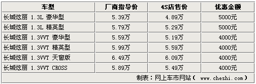 本次長城炫麗首先由廠家開始優惠,全系車型中1.3L兩款車型官降4000元,其他車型均降3000元。而經銷商處則可在廠家官降的基礎上再給出千元的優惠。