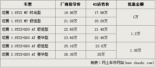 邁騰是一汽大眾主打中級車市場的車型,自上市以來一直受到了好評。今年3月份搭載DSG雙離合變速器的全新邁騰上市,缸內直噴發動機匹配DSG雙離合變速器的完美結合另邁騰再一次的成為了焦點。近日據網上車市價格系統監測顯示,邁騰全系最高優惠1.38萬元,具體價格詳情請看下表: