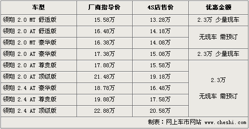 北京現代索納塔領翔于08年底正式上市銷售,為了提高領翔在同級別車型中的競爭力,在原有車型基礎上,領翔又新增了兩款車,并提高了多款車型的配置,提高了整車性價比。根據網上車市價格監測系統顯示,目前領翔全系優惠進一步增加,最高可優惠現金2.3萬元。具體行情如下: