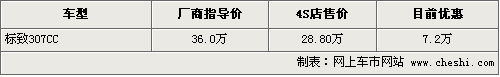 據4S店銷售人員介紹,目前標致307CC優惠幅度達到了7.2萬元,由原來的36萬元優惠到了28.8萬元,同時銷售的還有一款導航版車型,售價為29.8萬元。目前現車方面較為緊張,個別顏色需要消費者提前預訂。