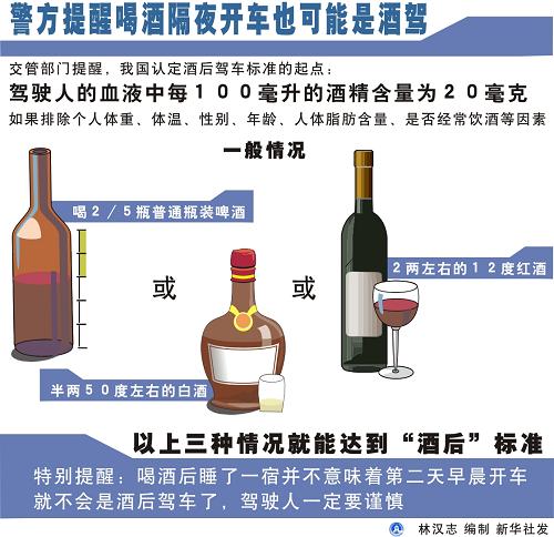 交管部門提醒,我國認定酒后駕車標準的起點是,駕駛人的血液中每100毫升的酒精含量為20毫克。從天津市以往查處情況看,如果排除個人體重、體溫、性別、年齡、人體脂肪含量、是否經常飲酒等因素,一般喝2/5瓶普通瓶裝啤酒,或半兩50度左右的白酒,或2兩左右的12度紅酒,就能達到“酒后”標準。特別是,喝酒后睡了一宿并不意味著第二天早晨開車就不會是酒后駕車了。(記者劉元旭)