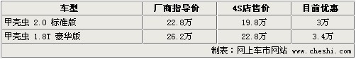 據(jù)4S店銷售人員介紹:目前甲殼蟲硬頂版本車型共有2款,2.0升與1.8T車型店內(nèi)均有現(xiàn)車,2.0升車型目前顏色較為齊全,有綠色、紅色、米色、黑色、藍色車款,最高可優(yōu)惠3萬元,1.8T車型指導(dǎo)價改為26.2萬元,優(yōu)惠后僅為22.8萬元。