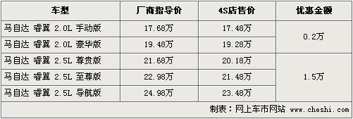 睿翼是一汽馬自達(dá)旗下的主力車型,憑借著運(yùn)動(dòng)性的流線型外觀和精準(zhǔn)的操控性贏得了消費(fèi)者的青睞。目前一汽馬自達(dá)睿翼共五款車型分別覆蓋了2.0和2.5排量。根據(jù)網(wǎng)上車市價(jià)格監(jiān)測系統(tǒng)顯示:睿翼相比節(jié)前優(yōu)惠有所減少,近期最高優(yōu)惠1.5萬元。具體車型行情如下:
