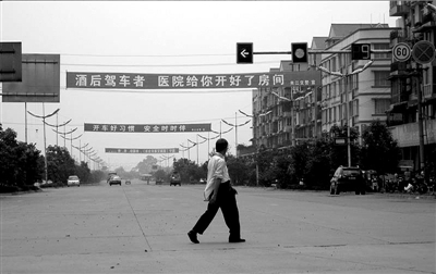 進入夾江城區,主要街道上隨處可見禁止酒后駕車的宣傳橫幅。其中,縣城瓷都大道與迎春南路交會處的兩條標語尤為醒目,上面分別寫著“酒后駕車者醫院給你開好了房間”“酗酒開車是駛向死亡與墳墓的選擇”等警示內容。