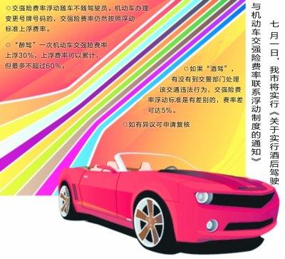 根據(jù)昨日省公安廳印發(fā)《關(guān)于實(shí)行酒后駕駛與機(jī)動(dòng)車交強(qiáng)險(xiǎn)費(fèi)率聯(lián)系浮動(dòng)制度的通知》表明,交強(qiáng)險(xiǎn)費(fèi)率與酒后駕駛交通違法行為相聯(lián)系的浮動(dòng)標(biāo)準(zhǔn)已經(jīng)明確,交強(qiáng)險(xiǎn)費(fèi)率浮動(dòng)隨車不隨駕駛員。記者從市交警支隊(duì)獲悉,7月1日起,我市將開(kāi)始實(shí)施。