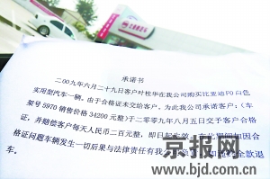 上午10時許,記者來到了位于豐臺區花鄉羊坊930號的金博藍汽車銷售服務公司,新車停車場里和展示廳內只有4輛新車待售,偶爾還有人在看車試車。買了車卻拿不到合格證的車主陸續來到4S店,他們手中都拿著一份“承諾書”,其中承諾8月5日交付合格證,并賠償一定金額,如果違約則全款退車。