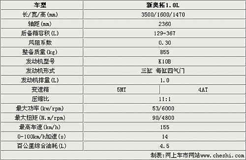 今年下半年將在長安鈴木投產的新奧拓,長寬高分別達到3500/1600/1470毫米,軸距也達到了2360毫米,與長安奔奔等車型同一級別。作為一款微型轎車,新奧拓的風阻系數達到了0.3,再加上855kg的整備質量,對整車的動力性能有很大幫助。