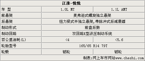 在底盤方面,江淮悅悅的前懸架采用麥弗遜式獨立懸架,后懸架為扭力梁式半獨立懸架。制動系統則采用前盤后鼓式,并采用雙回路X型液壓制動系統。另外,悅悅兩款排量的新車都采用全鋁輪轂,并采用165/65 R16尺寸的輪胎。