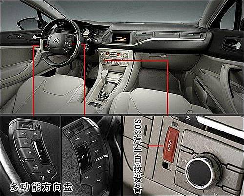 全新的C5采用第二代的中央固定控制式方向盤,包括有覆膜的控制鍵,相當便于巡航控制,收聽廣播或是接電話。新車還可以選裝雪鐵龍最新一代的導航裝備,提供有一個7英寸的顯示屏,語音激活的GSM電話,音響系統和衛星廣播系統。雪鐵龍的大型車輛以提供頂級的乘員舒適而聞名,全新的C5亦不例外,而且還特別注意了車內噪聲,懸掛與座椅。
