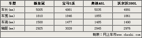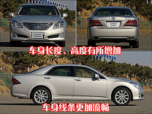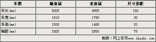 通過上表我們可以清楚的看出,豐田新皇冠車型尺寸與老款車型相比,長、寬、高分別增加了150mm、30mm和20mm。同時軸距也較老款車型加長了75mm。車身加大和軸距加長后得到的是更舒適的后排乘坐空間,車身變長對操控感會有一定的影響。