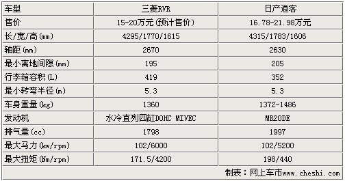 三菱RVR長寬高分別為4295/1770/1615,軸距為2670mm,與競爭車型逍客相比,車長還要略小一些,而軸距上稍具優勢,離地間隙也比較接近,三菱RVR為195mm、逍客為205mm。而在動力上RVR搭載的是4B10 1.8L發動機,最大功率102kw/rpm,而最大扭矩為171.5牛米。