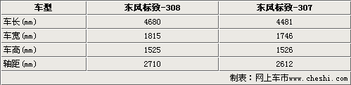 東風標致308車身尺寸明顯超過了標致307車型,4680mm車長、1815mm的車寬和1525mm的車寬,使得標致308外形更加大氣,同時在加上2710mm的軸距,進一步確保了標致308車內空間的寬敞,標致307的軸距僅為2612mm。