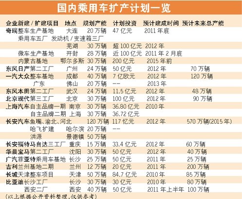 如此龐大的產能擴充計劃讓相關各方憂心忡忡。今年年初,工信部向國內車企下發了《關于調查汽車生產企業投資項目有關情況的通知》,通知要求車企上報現有產能情況和2010年~2015年產能規劃和投資情況。市場的火爆讓“產能過剩”的憂患呼聲逐漸熄滅,對部分廠家而言,最核心的任務仍然是增加產能。