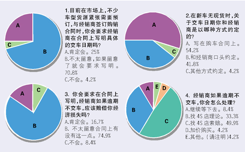 買車時你會仔細閱讀和經銷商簽訂的汽車購銷合同嗎?如果你購買的是緊俏車型需要等一段時間才能拿到新車,你會要求經銷商在合同上寫明具體的交車日期嗎?上周,本報對消費者買車時會否認真留意汽車購銷合同進行了調查,結果顯示,超過七成的消費者在買車時不太留意汽車購銷合同,不會特別留意合同上有無具體交車日期,也不太留意經銷商違約后應承擔什么責任。
