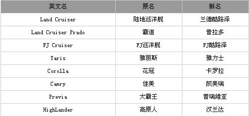 從最早的“霸道”因廣告事件更名“普拉多”(Prado),到“花冠”更名“卡羅拉”、“佳美”更名“凱美瑞”,以及最新的“蘭德酷路澤”和“FJ酷路澤”等。這也許是精明的日本人學習中國歷史并將之付諸實際的想法,他們希望在中國汽車市場能夠如秦始皇一般統一天下,并統一度量衡和文字。