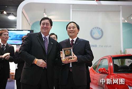 中新網1月16日電 當地時間1月14日下午,2008底特律車展組委會主席卡爾•加里亞拉來到吉利展臺,將本次展會一份非常特殊的大獎授予吉利集團董事長李書福,表彰他多年來領導吉利汽車不斷進取、不斷進步所取得的非凡成就。