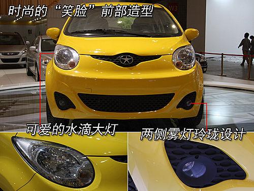 瑞麒M1的前臉非常具有特色,一體式前大燈配合進氣格柵,看上去感覺好像是一張憨態可掬的笑臉。不過前大燈內側的黃色轉向燈,使這款車頭的“笑臉”看上去是在做“斗雞眼”。瑞麒M1的前門把手采用黑色設計,后門把手也采用了奇瑞獨特的側拉手設計,與奇瑞A3和QQme一樣。外后視鏡采用黑色設計,圓形的設計更添幾分可愛的元素。
