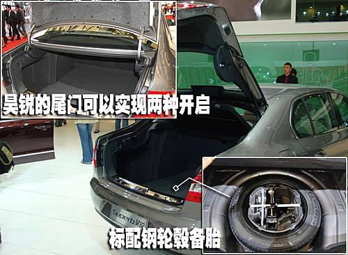 斯柯達昊銳的行李箱有兩種開啟方式,一種是像普通轎車一樣的僅代開行李箱蓋,另一種是完全將行李箱蓋連同后風擋玻璃打開(與明銳相同)的掀背式打開方式,這項配置在同級別車型中絕無僅有,其造價也要大大高于普通車型。斯柯達昊銳的備胎也是普通的鋼輪轂。