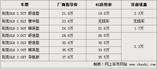 別克GL8是MPV市場一款非常受歡迎的車型,成為公司和商務(wù)用車的主要選擇對象,被稱為“陸上公務(wù)艙”。根據(jù)網(wǎng)上車市價格監(jiān)測系統(tǒng)顯示,目前這款車的優(yōu)惠幅度在原來2萬元基礎(chǔ)上增加到了2.3萬元,具體車型以及價格如下: