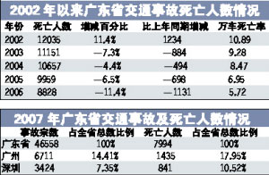 據廣東省公安廳交通管理局統計,2007年,全省共發生道路交通事故46558起,死亡7994人,受傷55565人,直接經濟損失約1.2億元,與2006年相比,事故起數減少9659起,下降17.18%;死亡人數減少834人,下降9.45%;受傷人數減少12086人,下降17.87%;直接經濟損失減少4391.6萬元,下降26.67%。