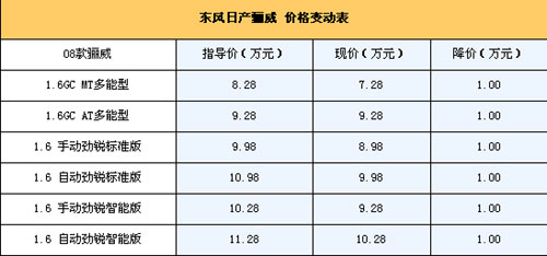 近日,我們從北京地區(qū)的一些東風(fēng)日產(chǎn)經(jīng)銷商處了解到,驪威目前全系優(yōu)惠1萬(wàn)元。詳情下表。