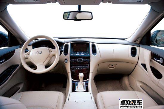 與X3注重動力與操控的主思路相反,EX35的跨界理念使它在舒適性方面贏得了不少實惠,轎車化的內飾配置和舒適度,使得EX35在駕乘舒適性方面與X3之間形成了不小的差距。首先感受到的就是轎車式的內飾布局以及座椅設計與SUV的典型設計背道而馳,至少在坐姿上找不出SUV的感覺,下陷式的座椅、視野模式完全是駕駛轎車的感覺。而且EX35的內飾設計中透出不少舒緩的氣氛,大量曲線的應用和圓滑的邊角過度帶來的是很輕松的視覺效果,與X3的棱角分明形成了鮮明的對比。淺色內飾給車廂內增加了不少明亮干凈的感覺,而且真皮包裹的多功能方向盤也采用了與內飾主色調相同的淺色設計,這樣的設計也許是在有意通過這種并不耐臟的顏色來顯示EX35的擁有者們的身份。EX35形狀獨特的儀表盤、擋把上的金屬裝飾、運動場形的空調出風口等這些別具匠心的設計,相信會吸引住不少女性消費者的目光。除此之外設計師們閑情雅致地在副座儲物箱的表面留下了3道凹痕,除了美觀與個性的效果外,似乎是在炫耀柔軟的材質和精湛的工藝。