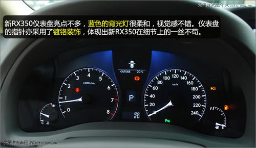 相對(duì)于充滿(mǎn)驚喜的方向盤(pán),新RX350儀表盤(pán)的亮點(diǎn)并不多,藍(lán)瑟的背光燈很柔和,視覺(jué)感不錯(cuò)。值得一提的是儀表盤(pán)的指針亦采用了鍍鉻裝飾,體現(xiàn)出新RX350在細(xì)節(jié)上的一絲不茍。