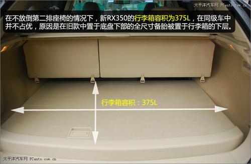 在不放倒第二排座椅的情況下,新RX350的行李箱容積為375L,在同級車中并不占優,原因是在舊款中置于地盤下部的全尺寸備胎被置于行李箱的下層。這樣設計的優點就是讓司乘人員可以在車輛需要更換輪胎的時候,不至于要趴在徹底拆卸備胎。目前,越來越多的城市SUV采用這樣的設計。