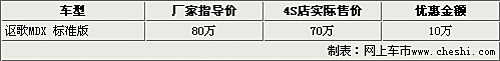 據謳歌4S店銷售人員表示,目前購買謳歌MDX的消費者除了可以得到10萬元的現金優惠外,還可以得到商家贈送的原廠汽車裝飾,如原廠腳墊,全車鍍膜。剛剛推出的MDX豪華運動版目前北京地區各4S店內還沒現車銷售。據銷售人員表示,豪華運動版MDX在外觀上與普通車型沒有太大區別,主要在輪胎上配備了全新的275系列超大尺寸輪胎和19英寸超大尺寸輪轂,讓外觀看起來更顯十足霸氣,在配置方面豪華運動版MDX添加了4項配置。