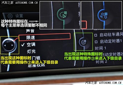 當(dāng)我們進(jìn)入“設(shè)置”選項(xiàng)的二級(jí)目錄時(shí),在二級(jí)目錄的左右兩邊我們可以看到兩種不同的圖標(biāo)。左邊的圓形帶有兩個(gè)小箭頭的圖標(biāo)表示如果想進(jìn)入左側(cè)的上級(jí)目錄需要使用②撥動(dòng)方式向左撥動(dòng)旋鈕進(jìn)入,而右邊的特殊圖標(biāo)表示如果想進(jìn)入右側(cè)的下級(jí)目錄需要使用③向下按的方式進(jìn)入。總的來說,這種左右分列的目錄形式比老款要更符合人們的日常習(xí)慣,因此比老款iDrive系統(tǒng)更容易得到用戶的認(rèn)可。