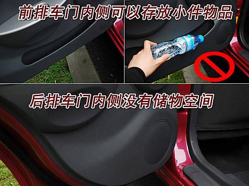 這款車的前排車門內側帶有一個細長條狀的存儲空間,可以放報紙、雜志及其他小件物品,礦泉水瓶是無法放入其中的。而后排車門內側則取消了這一設計,也許是考慮到后排有了儲物夾層的關系。