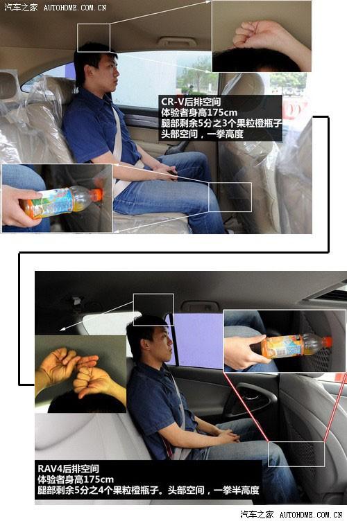 后排空間方面,之前我們看到了RAV4軸距比CR-V長了4厘米,實際體驗中,這4cm在坐進人之后的空間差距還真不小,大家仔細看圖,RAV4剩余了5分之4個瓶子長度空間,而CR-V只剩下5分之3個瓶長,基本上后排腿部CR-V比RAV4短了3-5厘米的距離。(前排位置都是同一人調整好的)。