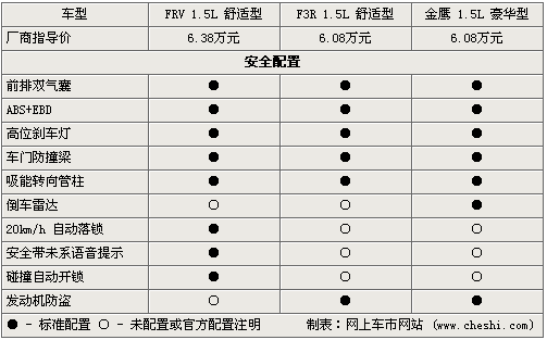 在安全配置方面,三款車型都標(biāo)配前排雙氣囊、ABS+EBD、高位剎車燈、車門防撞梁這樣的基本配置,同時FRV還帶有20km/h自動落鎖、安全帶未系語音提示、碰撞自動開鎖這三個實(shí)用配置,但沒有配置發(fā)動機(jī)電子防盜。吉利金鷹是唯一配置倒車?yán)走_(dá)的車型,能為駕駛員泊車提供幫助。