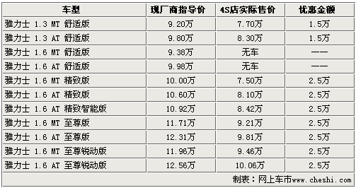 據4S店銷售人員介紹,目前廣州豐田各4S店內雅力士1.3L現車較少,而1.6排量的車型就相對比較充足,并可提供試乘試駕服務,消費者可在展廳內近距離接觸展車、親身體驗試駕車后直接購買現車。銷售人員表示,現在到店購買雅力士的消費者可享受到最高達2.5萬的價格優惠,還可得到商家贈送的簡單裝飾等。