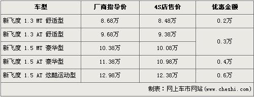 據廣州本田北京地區4S店銷售人員介紹,新飛度 1.5L炫酷運動版的優惠金額為6000元。新飛度在售車型分為1.3L及1.5L共5個車型在售,1.3L手動舒適版的優惠金額為2000元,現售價為8.48萬元。1.3L自動舒適版的優惠金額為3000元,現售價為9.38萬元。1.5L豪華版的手動和自動車型經4000元優惠后,現售價分別為10.08萬元和10.98萬元,1.5L炫酷運動版的優惠6000元,現售價為12.38萬元。