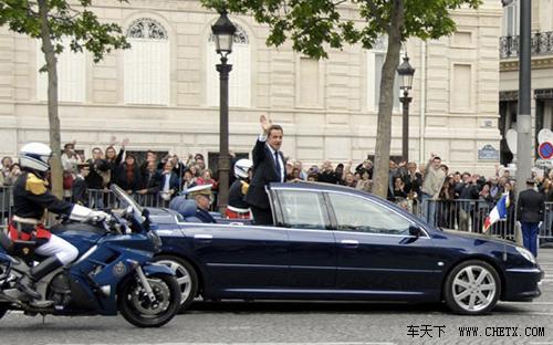 法國總統薩科齊的座駕是一輛豪華版標致607,全車超過5米,配備由鋼板和玻璃材質組成了自動折疊車頂。這輛專門為總統設計的標致607 Paladine在法國Cerizay的埃利茲(Heuliez)工廠誕生。