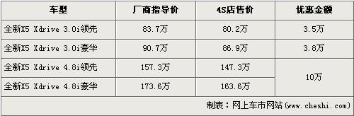 據經銷商處銷售人員介紹,近期購買X5的消費者可以得到最高10萬元的優惠。新款的寶馬X5 3.0i領先版車型和3.0i豪華版車型分別優惠3.5萬元和3.8萬元。經優惠后,新X5 3.0i領先版和豪華版售價分別降為了80.2萬元和86.9萬元。前段時間沒有優惠的新寶馬X5 4.8i車型目前出現了全系最高10萬元的優惠。經優惠后,頂配的4.8i豪華版車型售價降到了163.6萬元,跌破了170萬。銷售人員還介紹,店內目前沒有領先版車型現車,欲購買的消費者需交10萬元訂金,約等1個月后可提車。