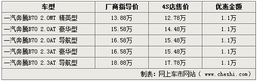 新款B50的上市搶了老款B70不少風頭,目前各家銷售人員均表示北京個各展廳內09款奔騰現車充足,現在購車的消費者將最高享受到1.1萬元元現金優惠。據了解,此車型銷售較快的型號主要是2.0L的導航版車型,以及2.3L高配的兩款車型。優惠后的價格在12.78萬-17.78萬元之間。