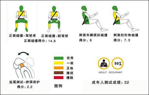 昊銳在正面碰撞中對(duì)駕駛員與乘客的胸部保護(hù)一般,頭部和盆骨保護(hù)最好,駕駛員小腿可能受踏板變形有所傷害。在側(cè)面模擬車(chē)體碰撞試驗(yàn)中,昊銳對(duì)駕駛員保護(hù)良好獲得滿分,但柱體碰撞中對(duì)胸部保護(hù)不過(guò)。對(duì)于頸部保護(hù)試驗(yàn),昊銳只獲得了邊緣成績(jī),對(duì)于頭枕的設(shè)計(jì)有改良空間。最終對(duì)成人保護(hù)得分率為90%