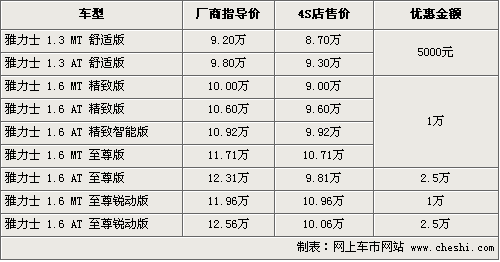 雅力士在歐洲是一款非常受歡迎的A0級小車,但在08年進入國內銷售后,其銷量并不樂觀,但是從這款車的配置、安全性方面,仍然是一款值得購買的小車。根據網上車市價格監測系統顯示,目前這款車最高優惠幅度達到了2.5萬元,其中有少量裝載進口發動機的1.6排量車型仍有銷售,具體行情如下: